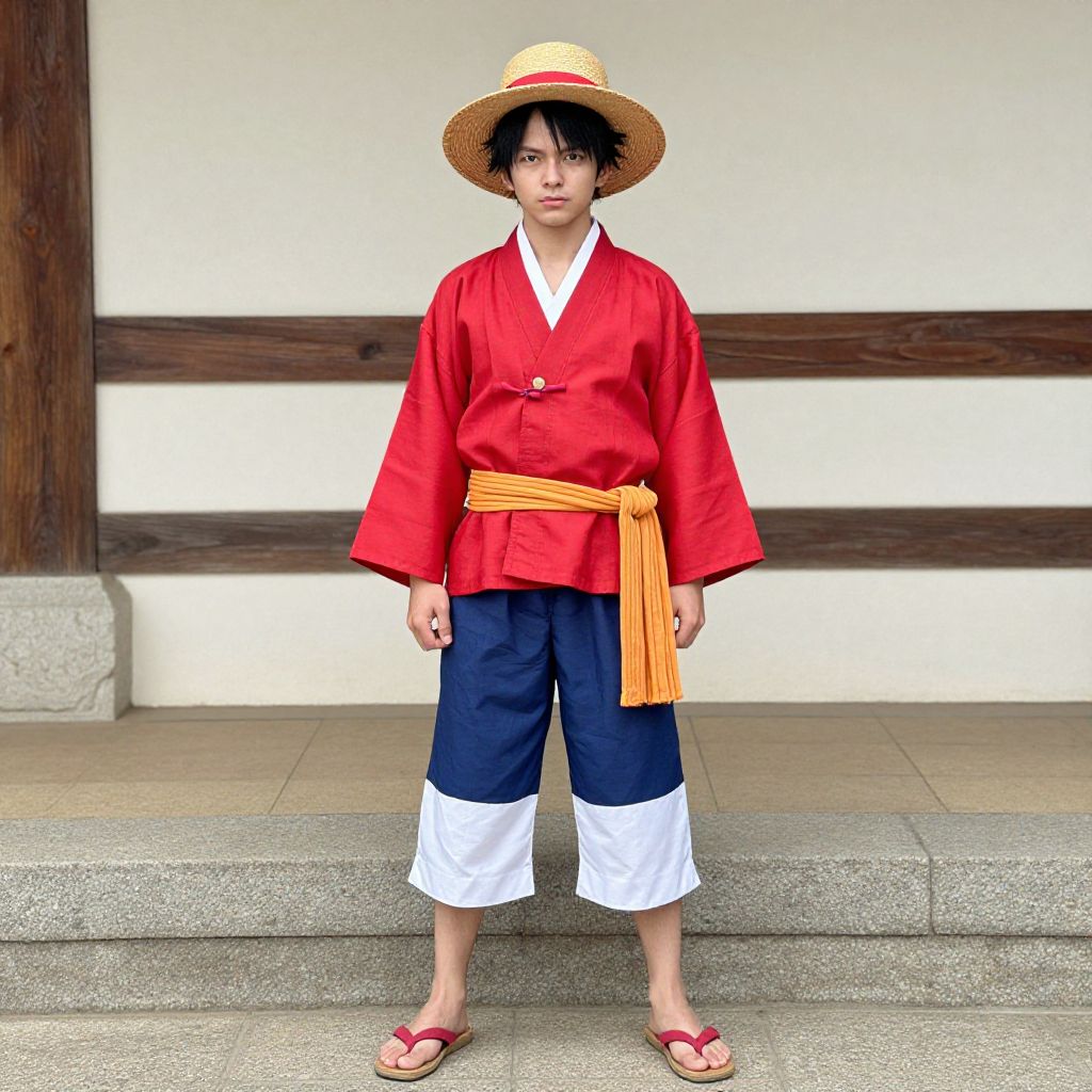 Luffy outfit wano costume, 1boy, male focus, solo, hat, black hair, sandals, full body, looking at viewer, standing, outdoors, pants, korean clothes