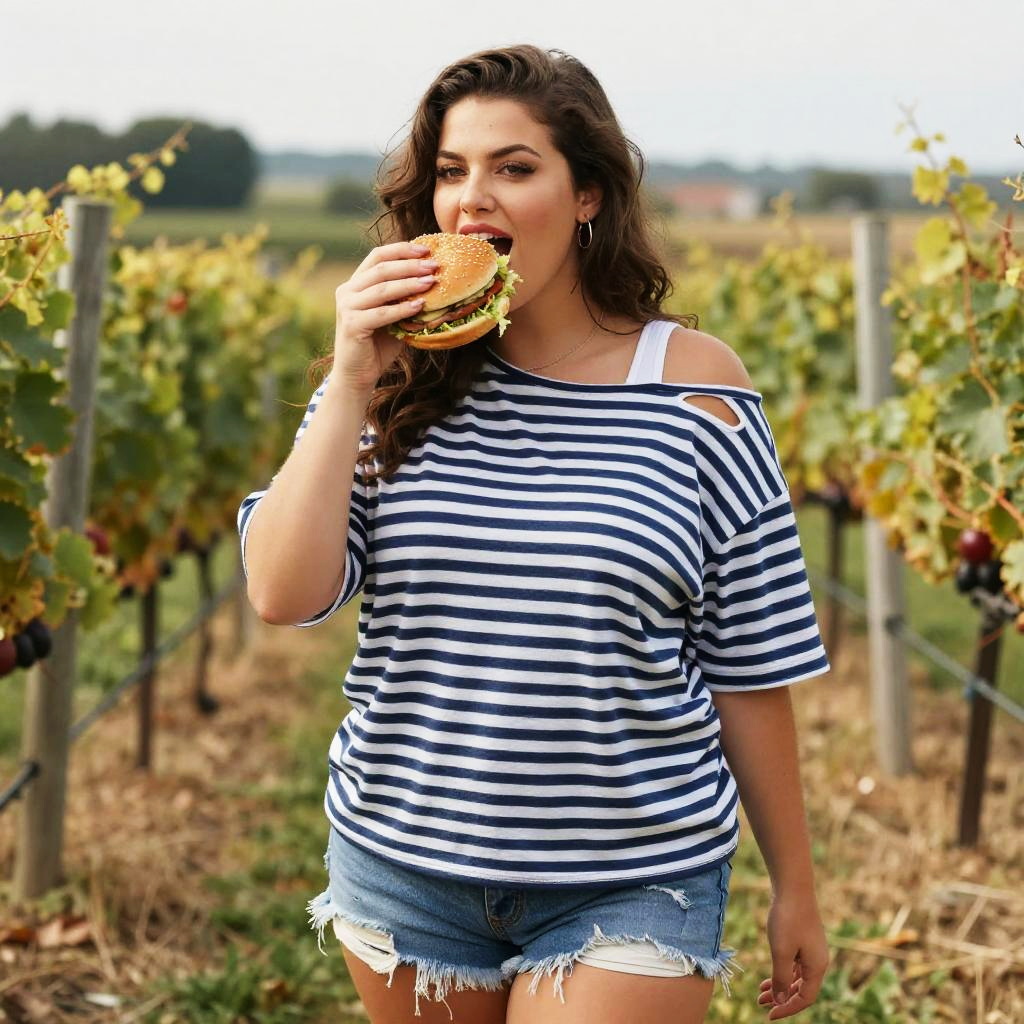 A Curvy woman in a casual style, wearing an oversized navy blue and white striped T-shirt with shoulder cut-outs layered over a white tank top and frayed denim shorts, enjoying a burger feast in a vineyard, captured in a selfmade hero visual style. Sexy. Pretty face and beutiful eyes