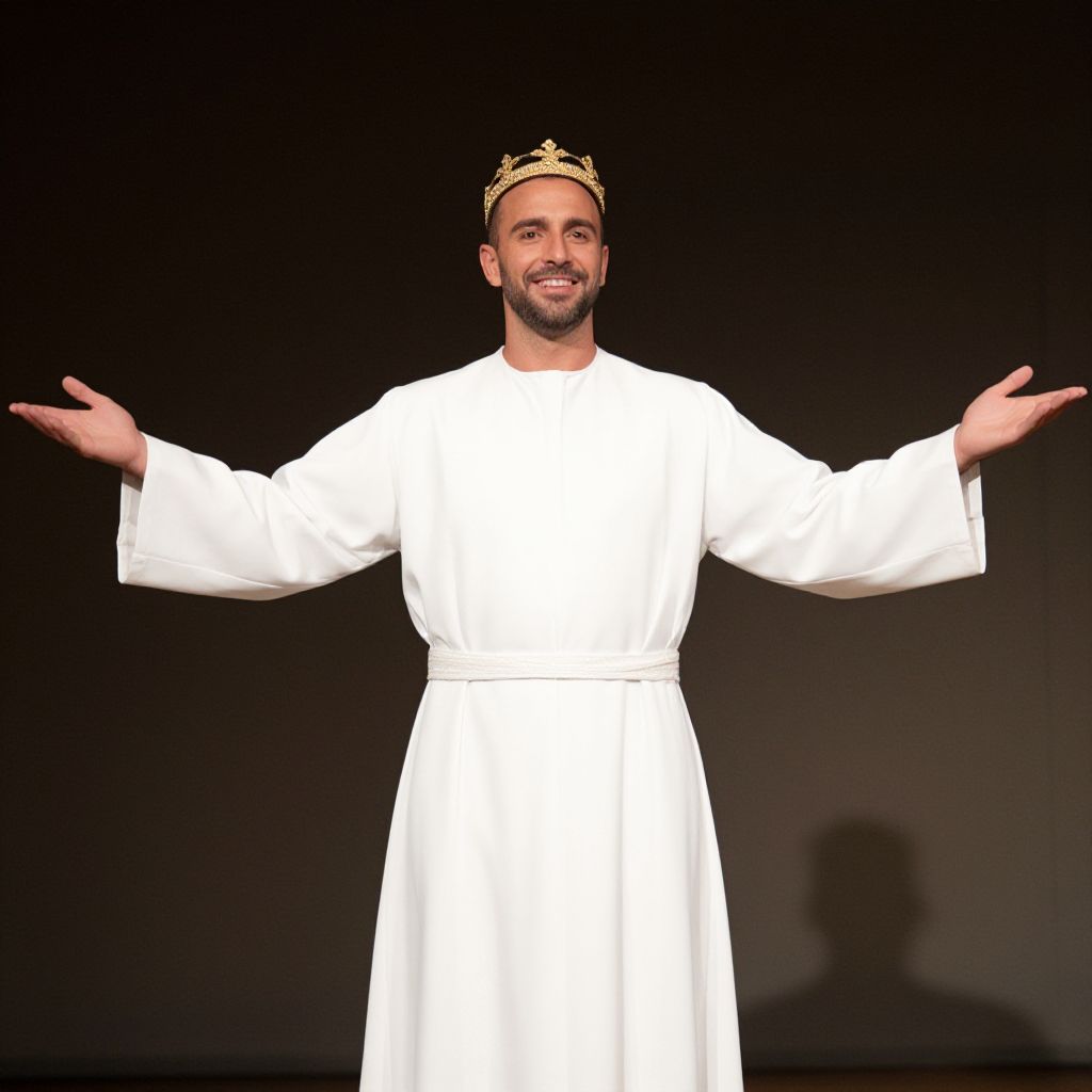 Man wearing a white robe with a white sash around his neck and a crown on his head. He is standing with his arms outstretched and has a smile on his face.