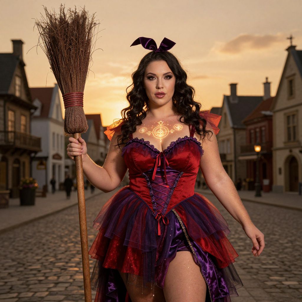 A high-definition portrait of a confident plus size woman in a detailed plus size witch costume, posing in a Gothic village square at sunset, her red and purple layered dress with tulle accents, a large broom in hand, glowing magical symbols on her chest, fair skin with warm golden highlights, dark curly hair tied with a velvet ribbon, warm amber lighting from the setting sun. The woman has big breasts and cute face