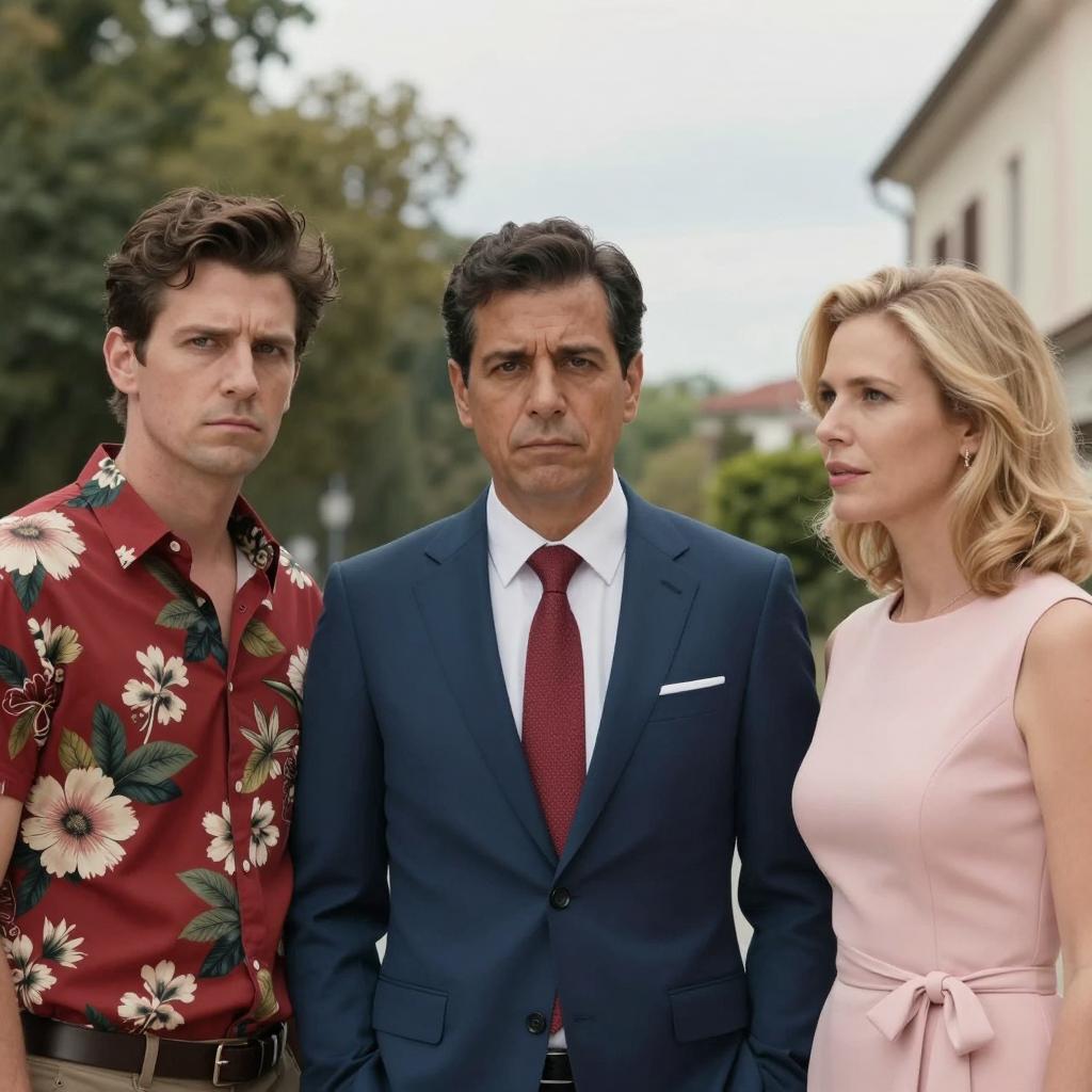 Three adults engaged in an intense conversation outdoors near a residential area. The group consists of a blonde woman with curly hair wearing a beige coat and white blouse, standing between two men. One man has dark hair, dressed in a brown jacket over a light blue shirt, and the other has light brown hair, wearing a navy shirt. They stand in front of brick buildings with greenery and an overcast sky in the background.
