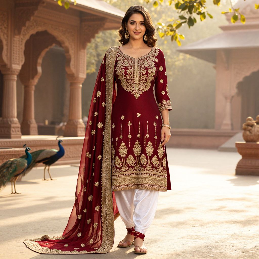 Photograph of a smiling South Asian woman in a maroon traditional kurti with gold embroidery, white salwar, standing in an ornate,