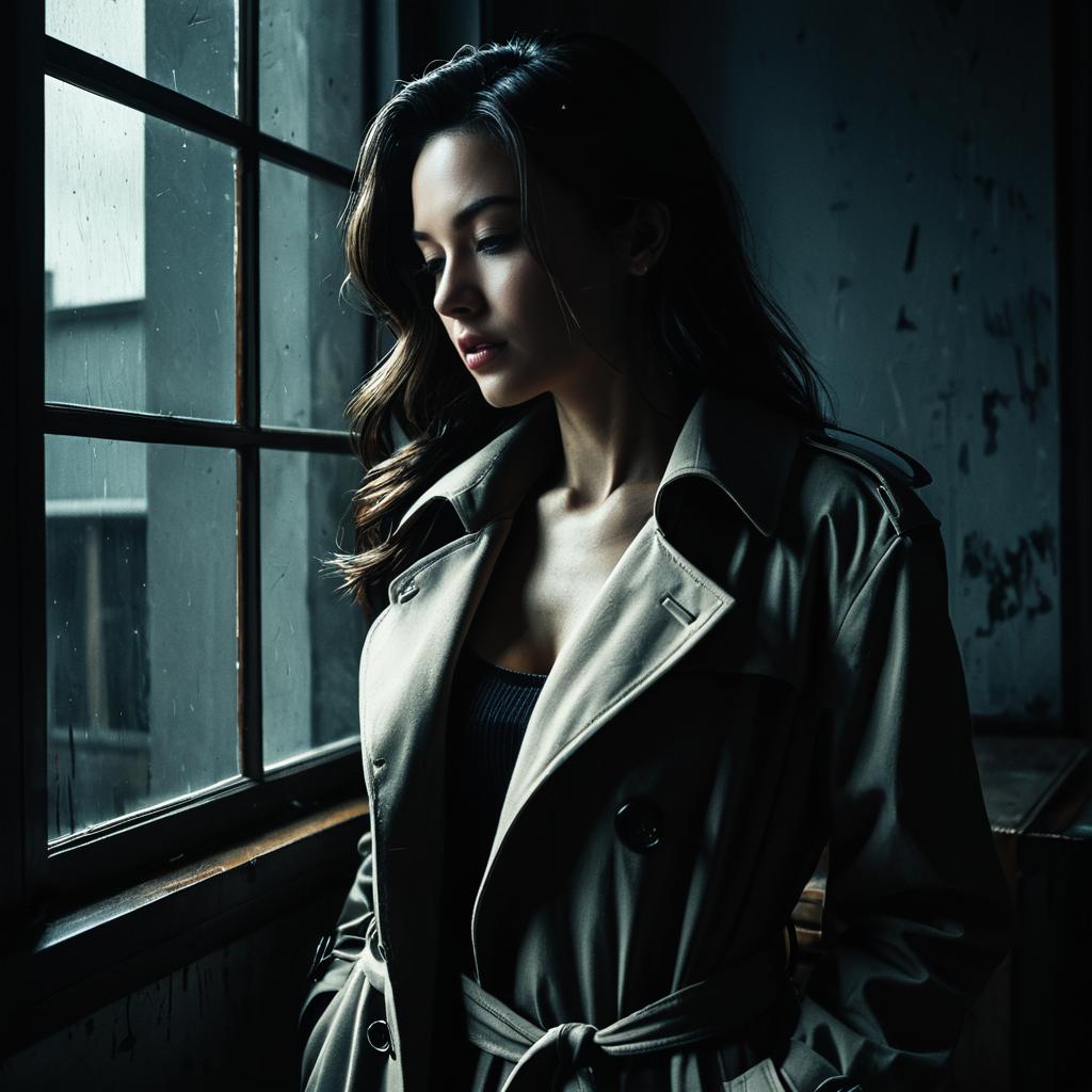 Half body portrait of a mysterious woman by a window, trench coat, dynamic lighting, shadows, sultry, anime, in the style of film noir, 8k, rough, muted colors, digital painting, very intricate