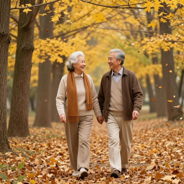 Happy elderly couple walking hand in hand through a scenic autumn forest, leaves falling around them, golden hues, serene smiles and warm clothing, tender moment of joy and companionship, detailed textures on trees and foliage