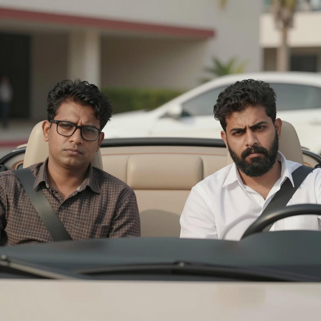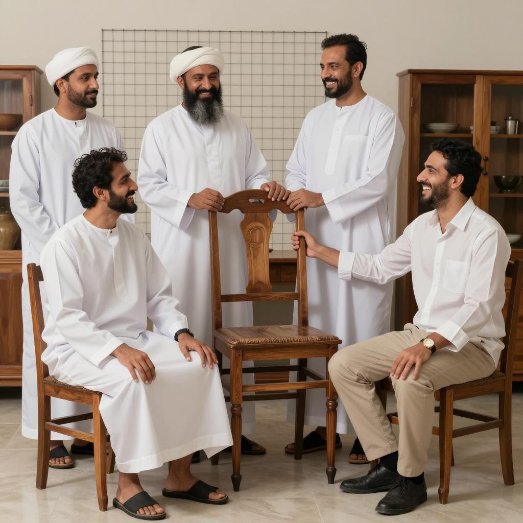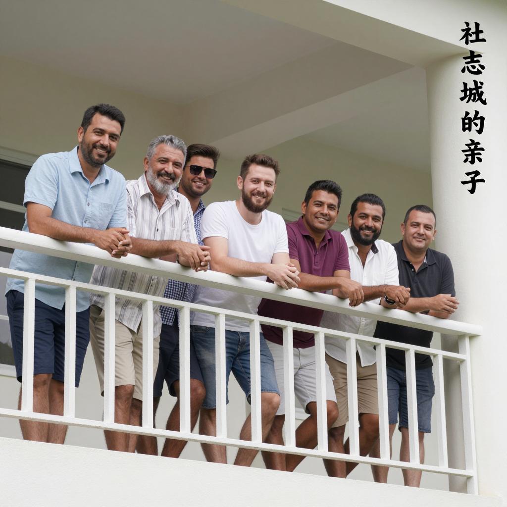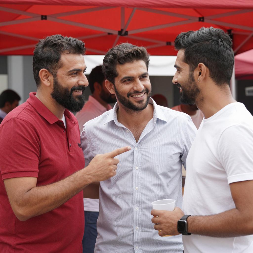 Photograph of three men outdoors under a red canopy. Bearded man in red polo shirt points, smiling. Central man with dark hair, striped shirt, smiles. Right man with dark hair, white tank top, holds drink, smiles. Background includes another man in pink shirt. All men interact closely, smiling.