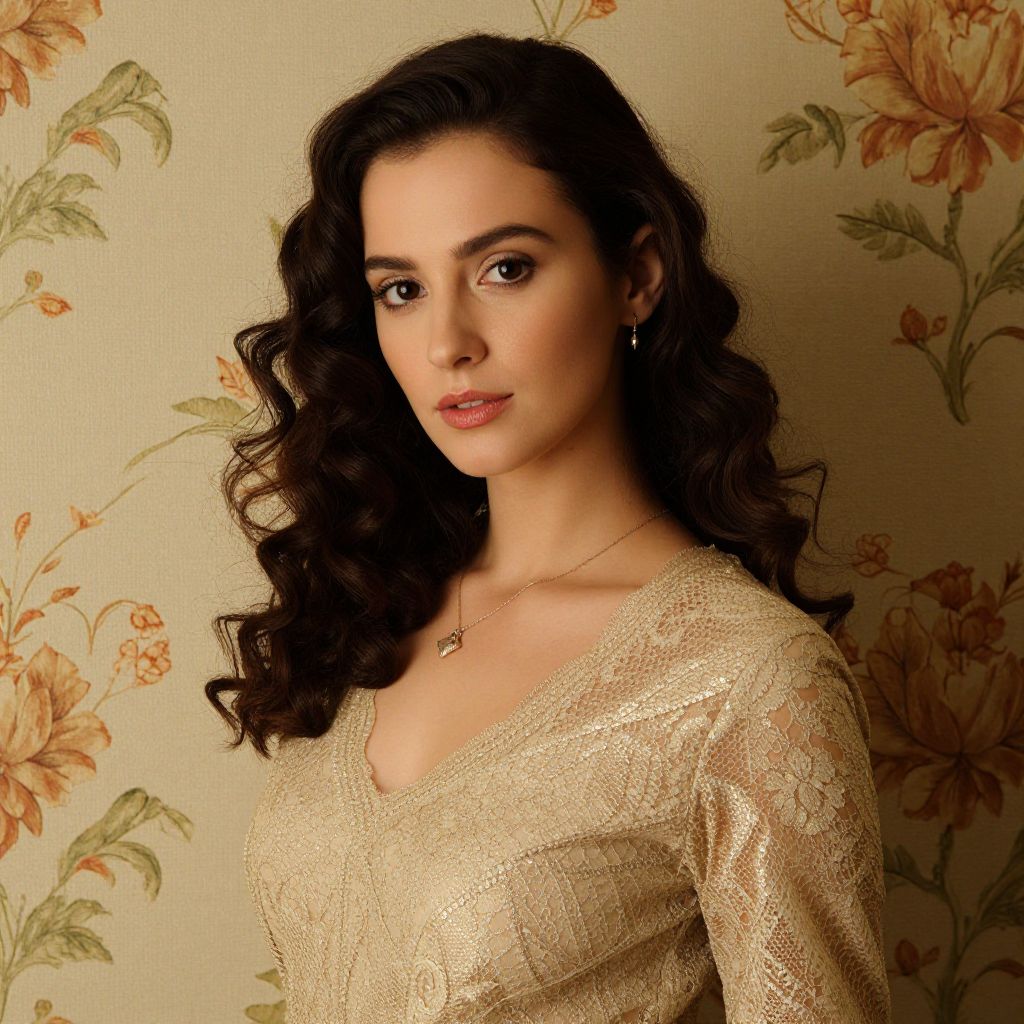 Elegantly poised against a vintage floral wallpaper backdrop, a woman with cascading dark curls wears a shimmering gold lace top, complemented by a delicate necklace and small earrings, exuding timeless beauty and sophistication.