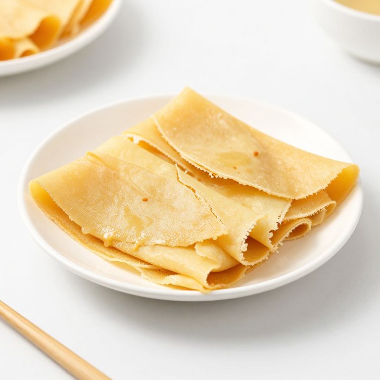 Golden crepes neatly folded and stacked on a pristine white plate, showcasing a delicate balance of texture and color against a minimalist tabletop setting.