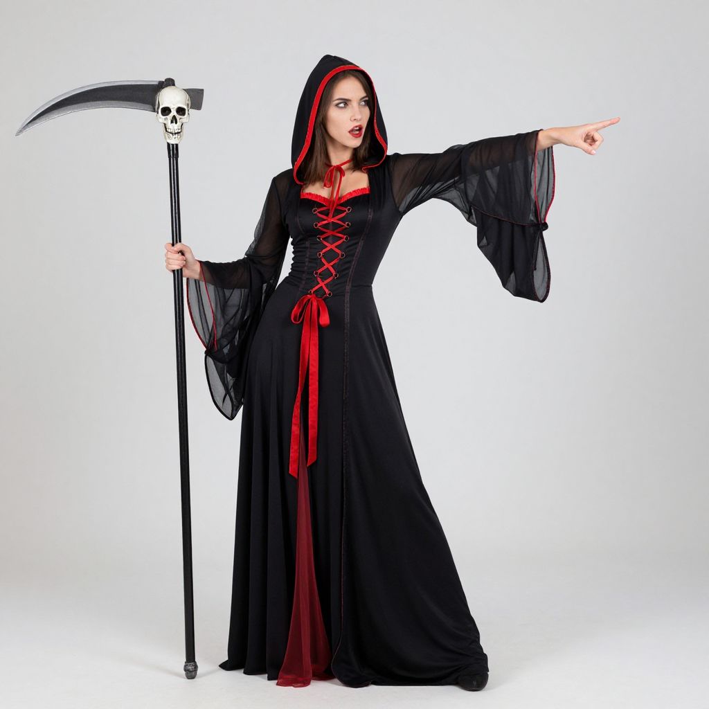 Woman modeling a Halloween Lady Reaper costume, featuring a long black dress with red accents, sheer sleeves, and a hood, while holding a grim reaper scythe with a skull handle and pointing dramatically to the side.