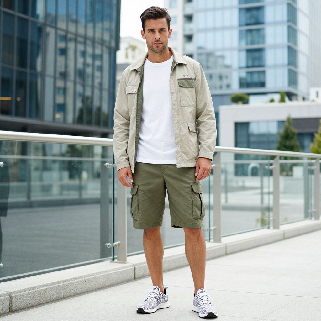 A man, classic white crew t-shirt, tailored cargo shorts, breathable mesh trainers, lightweight utility jacket, olive green and beige palette, modern glass buildings, lithographic film style, relaxed expression, vibrant urban backdrop. Man has masculine face and piercing eyes