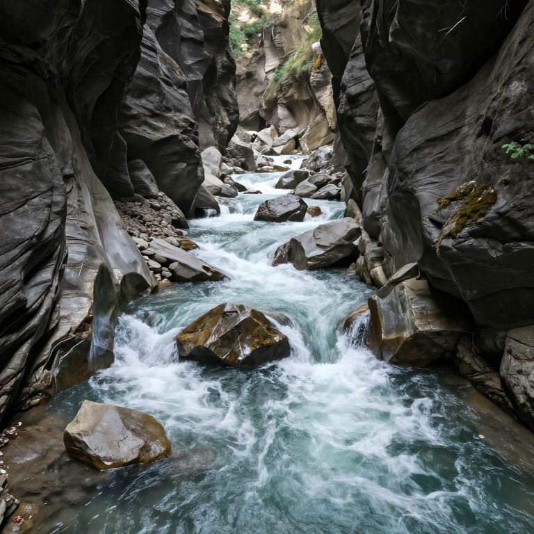 Photograph of a narrow, rocky canyon with turbulent, white-water stream flowing between dark, jagged cliffs, sunlight filtering from above.