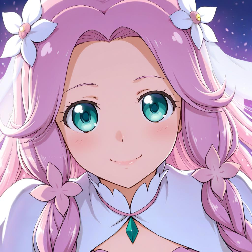 Hanami kotoha, precure, 1girl, green eyes, multicolored eyes, flower in eye, pink hair, long hair, twin braids, hair flower, magical girl, magical girl, by artist natsuya (kuttuki), illustrious