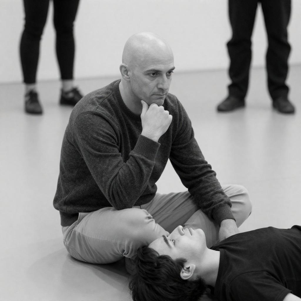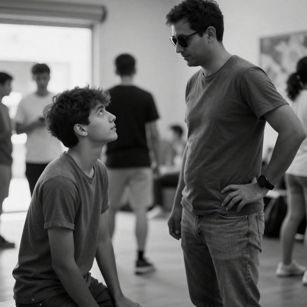 Black-and-white photograph of a lively scene. A young man with short, dark hair and a t-shirt kneels on the left, looking up at a taller man with sunglasses and a t-shirt standing on the right. Background includes blurred people and a brightly lit window. The taller man's hand rests on his hip, creating a casual, engaging interaction.