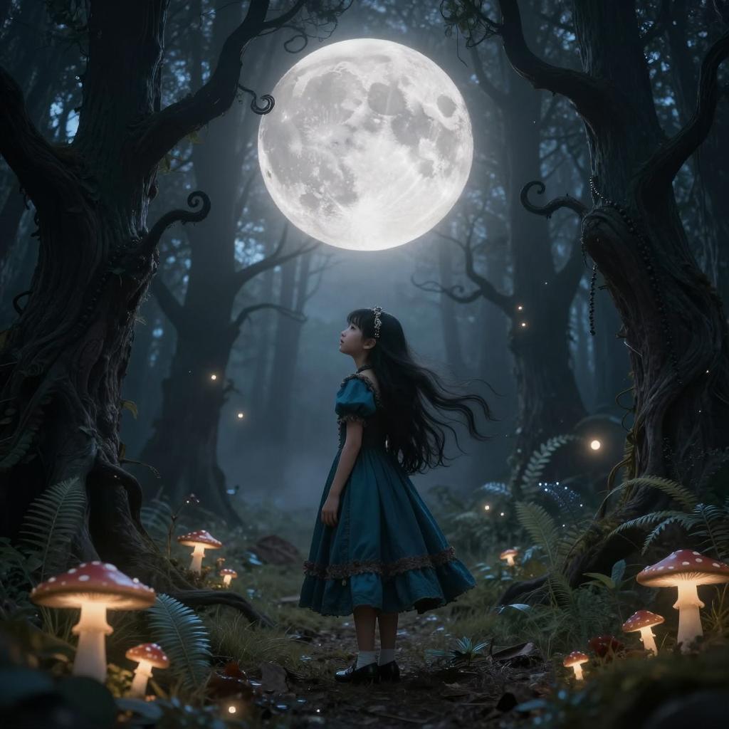 A young girl with long flowing black hair wearing a dark teal vintage dress stands in an enchanted forest clearing under a large glowing full moon. The forest has tall, twisted black trees with swirling branches and bioluminescent mushrooms and plants scattered on the forest floor. The atmosphere is mystical and eerie yet magical, with soft glowing orbs floating in the misty air, capturing a gothic fairy tale scene at twilight.