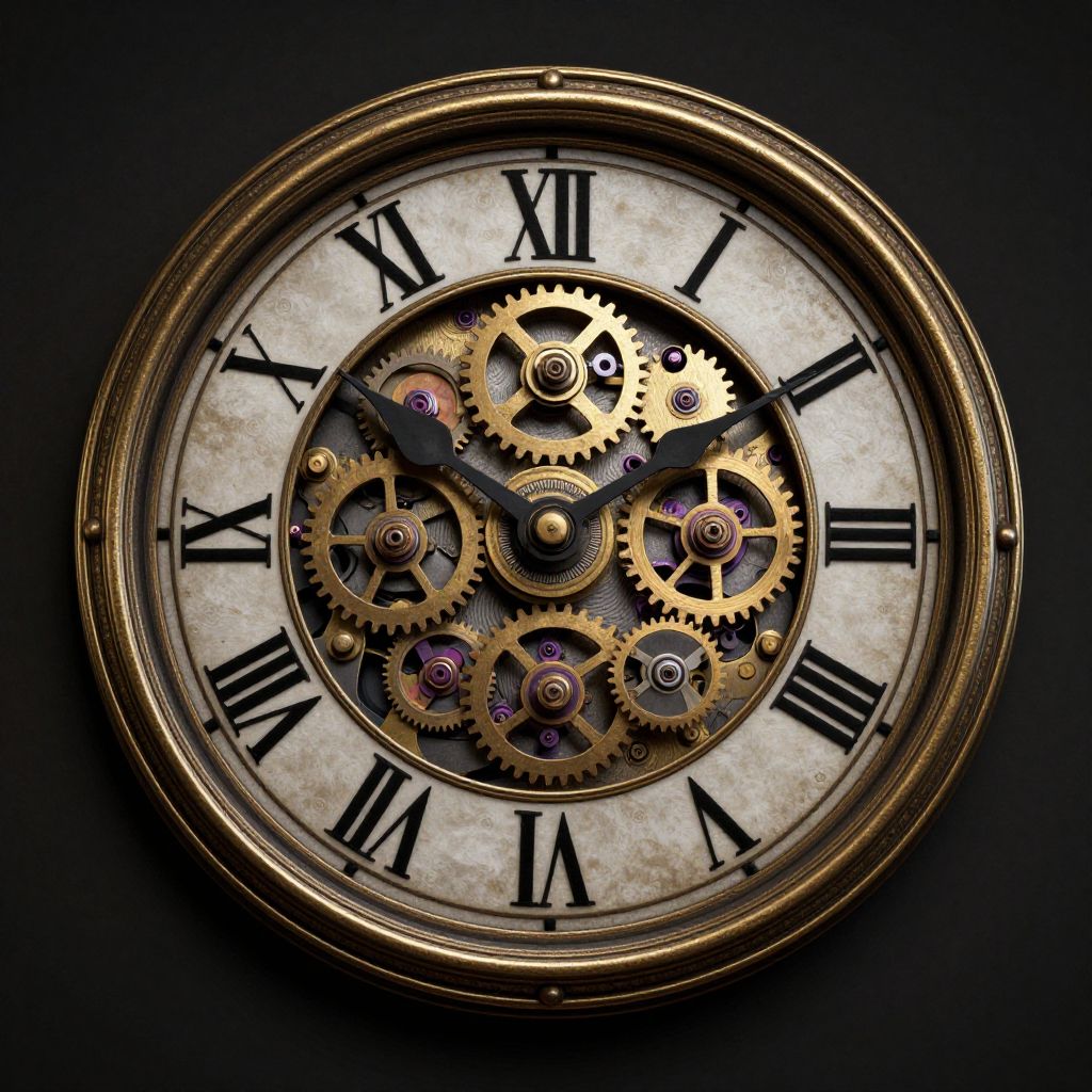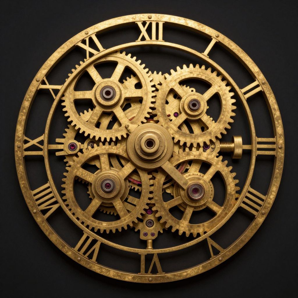 Elegant clockwork birds soar gracefully in intricate geometric patterns, their golden gears and mechanical bodies shimmering against a soft, neutral backdrop as they migrate in harmonious unison.