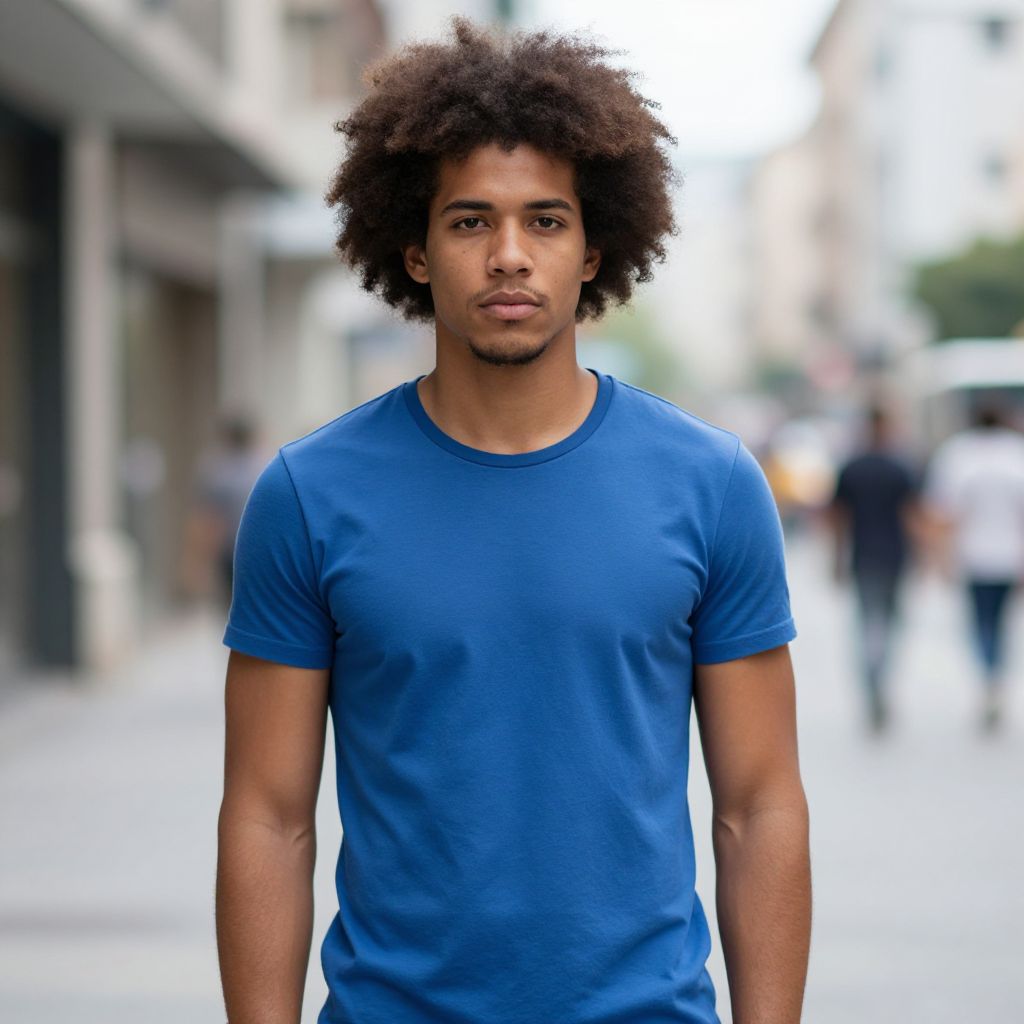 Photograph of a young man with medium brown skin and a voluminous afro hairstyle standing outdoors on a city street. He's wearing a fitted, blue, short-sleeved t-shirt that shows off his toned arms. He looks directly at the camera with a neutral expression. The background is slightly blurred, showing an urban setting with buildings and some people walking.