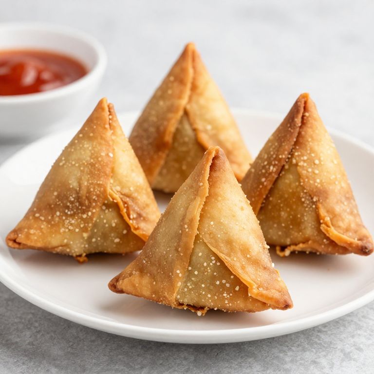 Photograph of five golden-brown, triangular samosas with a crispy texture, sprinkled with sesame seeds, arranged on a white plate. The samosas are slightly overlapping, showcasing their flaky, layered crust. In the blurred background, there is a white bowl containing red chutney. The plate and bowl are placed on a gray, textured surface. The image is brightly lit, highlighting the samosas' crunchy exterior and warm, inviting color. The focus is sharp on the samosas, with a shallow depth of field blurring the background.