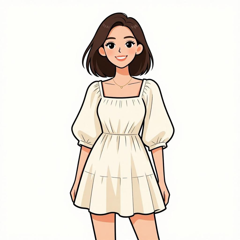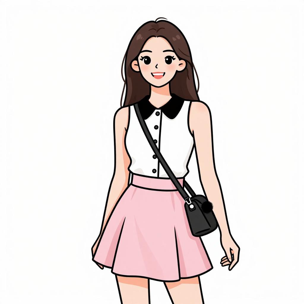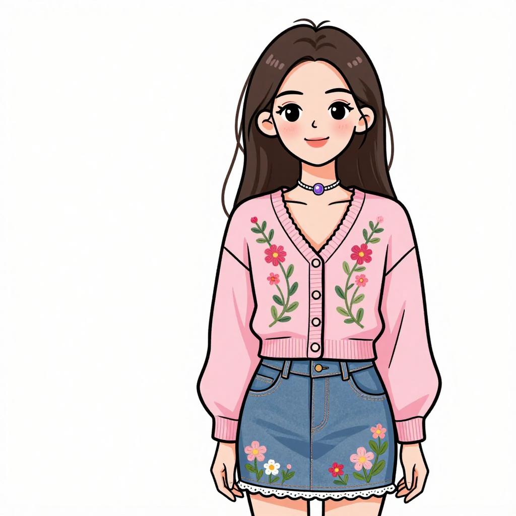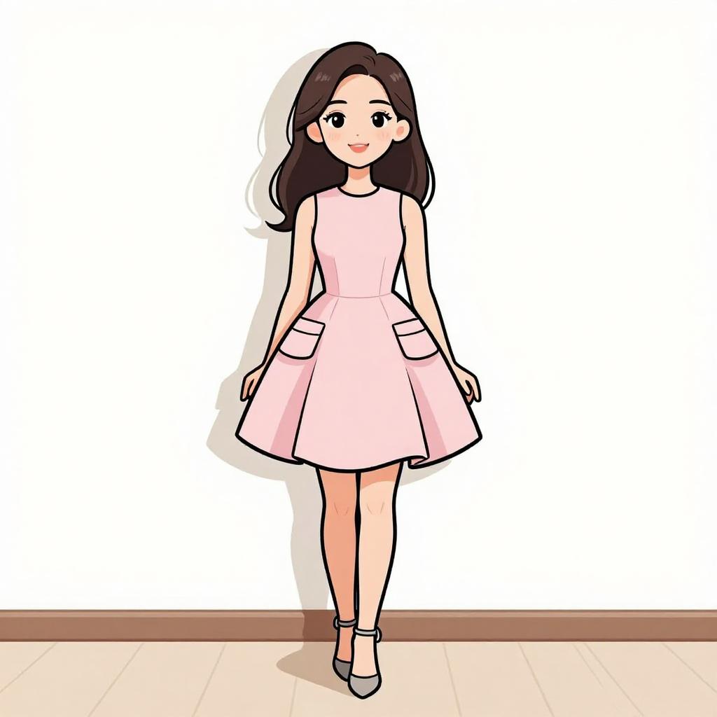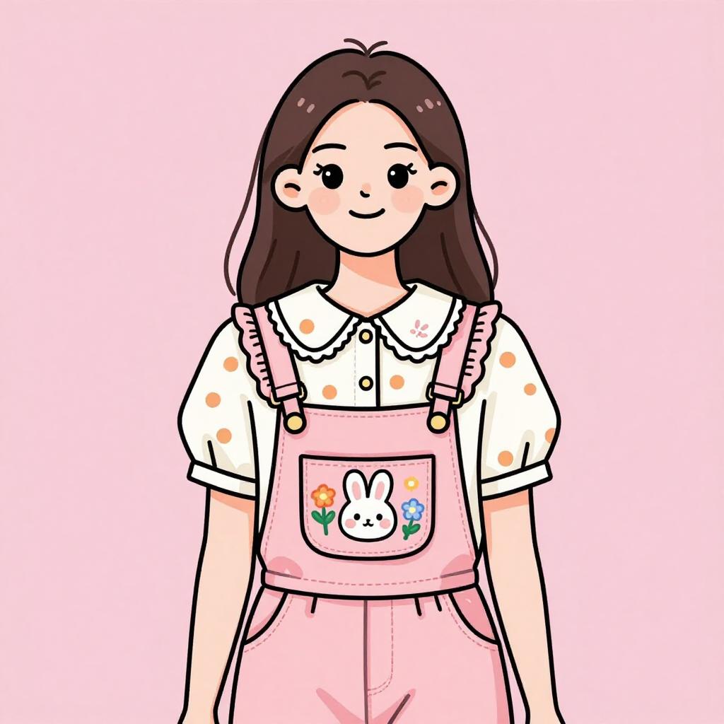Woman with pretty face and pretty hair. smiling Woman, playful kawaii, pastel pink pinafore dress with a flared skirt, white long-sleeve mock turtleneck top underneath, pastel blue, pink, and yellow lace panel on the front, shoulder straps, photo studio background --sref 1467