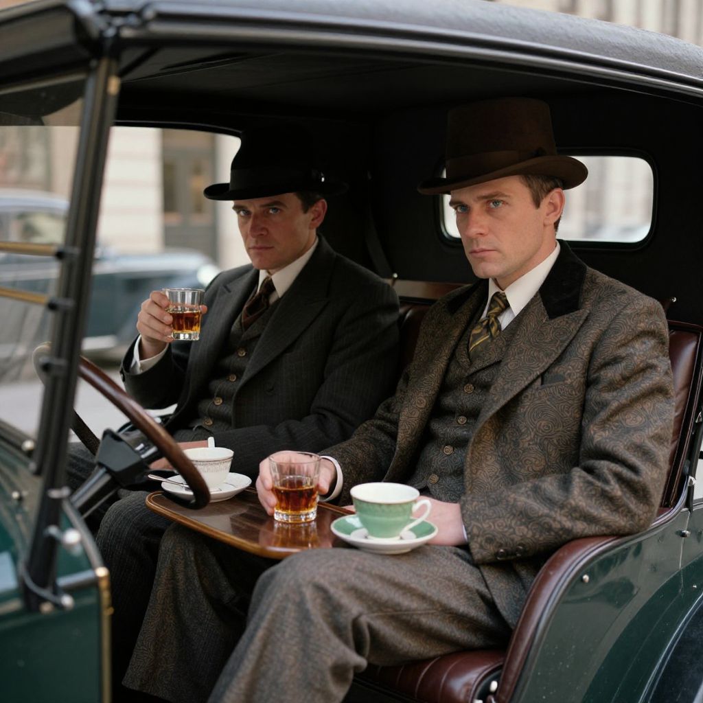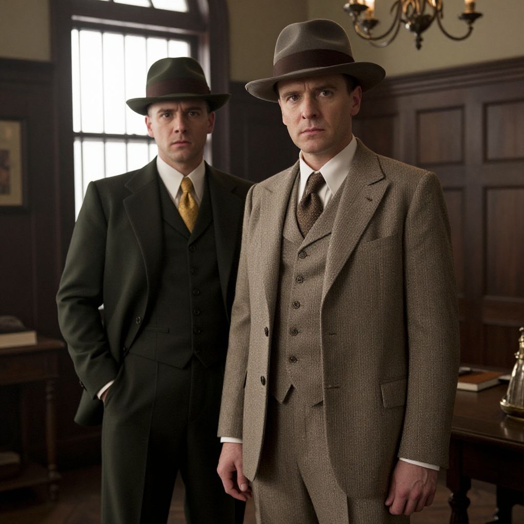 The image presents a striking visual contrast between two men, both dressed in period-appropriate attire reminiscent of the early 20th century. The man on the left is adorned in a dark, tweed suit with a crisp white shirt and a neatly tied tie, exuding an air of sophistication and refinement. His gray flat cap adds a touch of ruggedness to his otherwise polished appearance. The man on the right, however, is depicted in a more rugged and intense manner, with a gray flat cap that complements his stern expression. He is seen smoking a cigarette, with smoke billowing from his mouth, adding a sense of mystery and intrigue to his character. The background is dark and moody, enhancing the dramatic effect and drawing attention to the men's faces and attire. The overall composition is balanced, with the two men positioned side by side, creating a visual dialogue between their contrasting styles and personas.