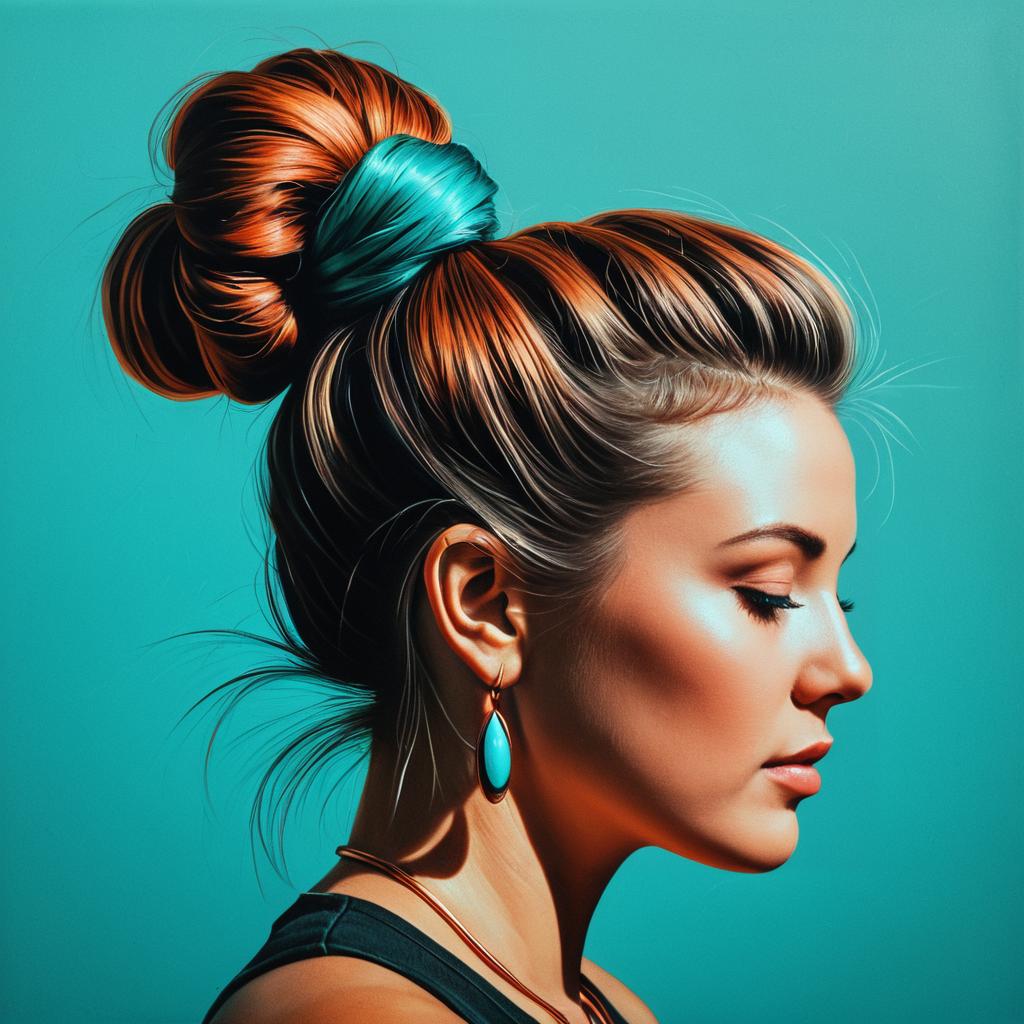 Woman with neon blue and pink, curly hair, airbrush painting, highres, detailed, expressionism, intricate patterns, professional, vibrant lighting.