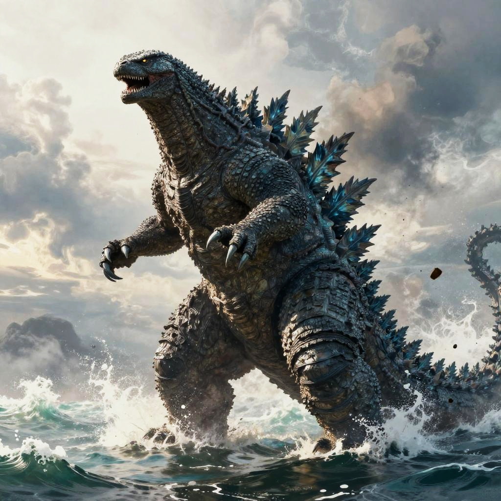 Digital illustration of Godzilla emerging from ocean waves, surrounded by splashing water and dramatic, cloudy sky. Godzilla's textured, scaly skin and sharp dorsal