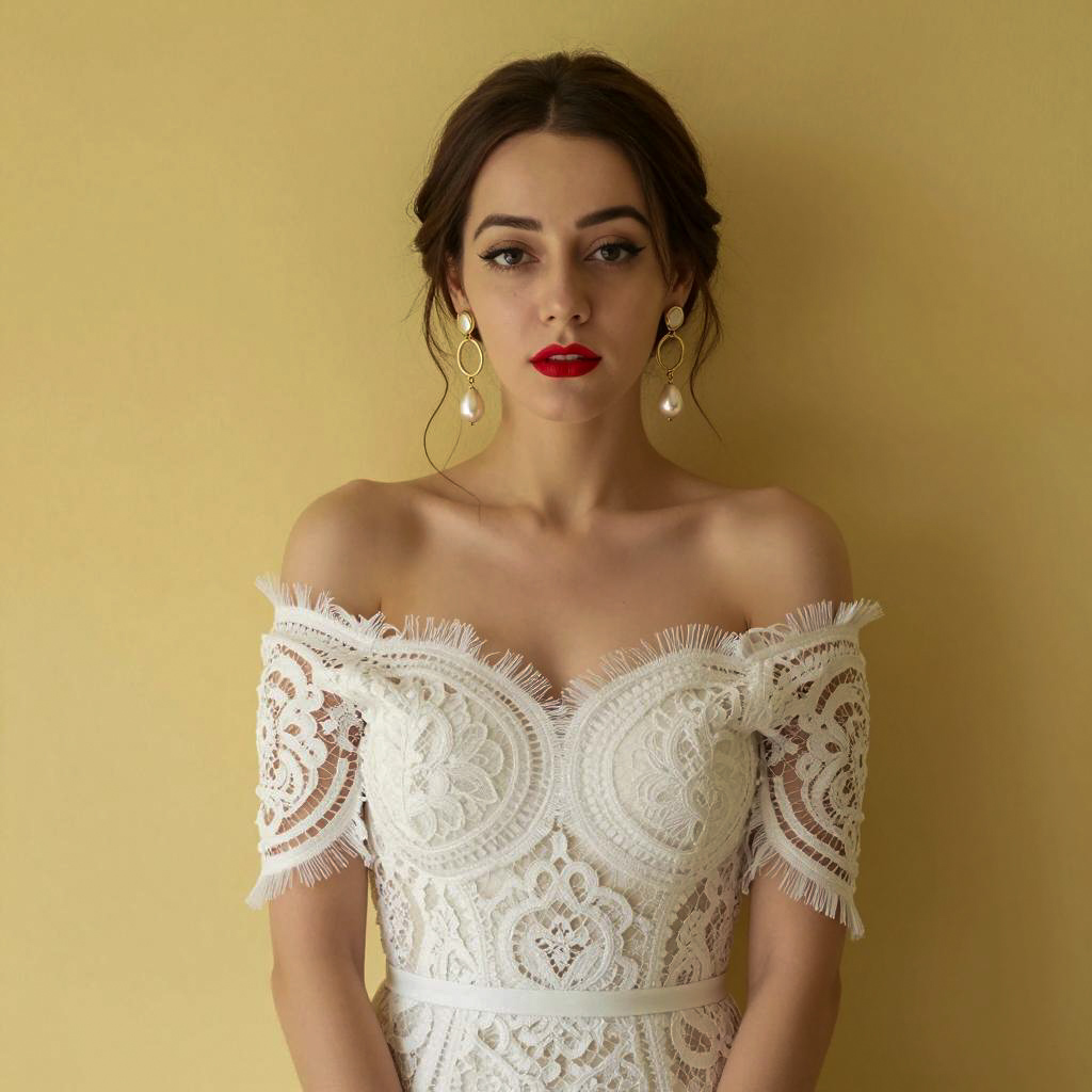 Woman in White Lace Dress with Pearl Earrings