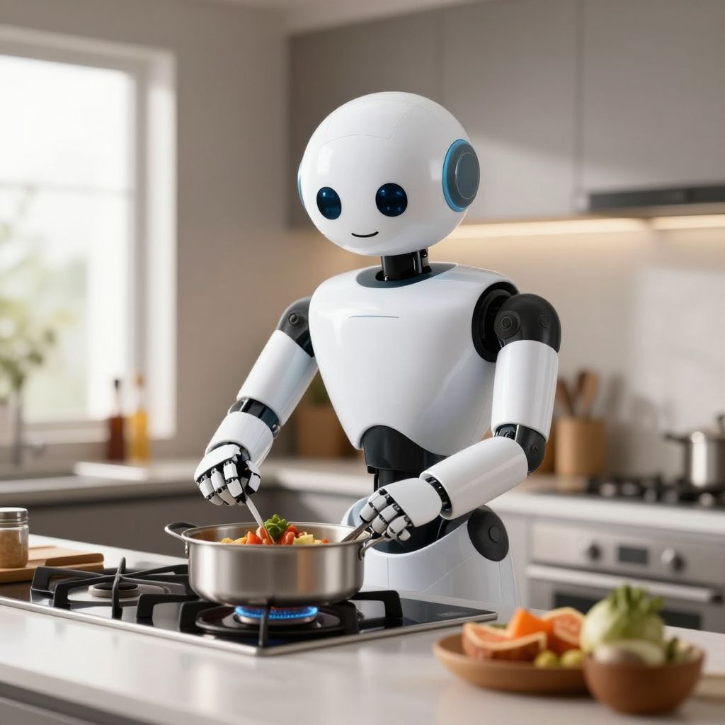 Helpful robot cooking in a modern kitchen, stainless steel design, friendly expression, preparing gourmet meal, cozy home environment, soft natural light