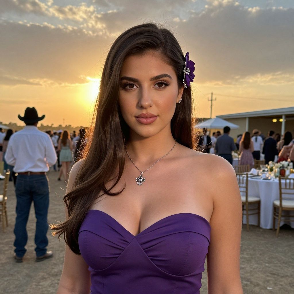 "red sequin homecoming dress, 1girl, solo, dress, long hair, red dress, breasts, flower, brown hair, outdoors, realistic, brown eyes, looking at viewer, cleavage, blurry, plunging neckline Realistic photo of casual sexy person with pretty face"