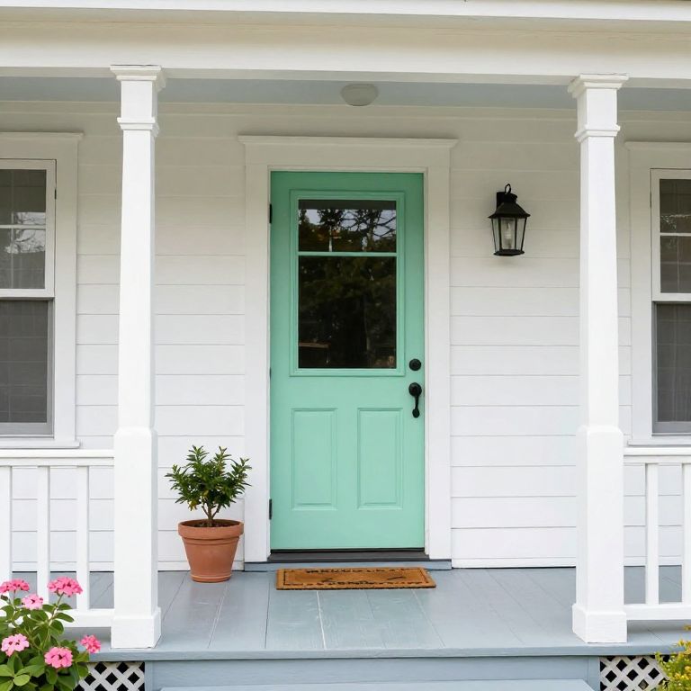 Photograph of a white wooden porch with mint green door, black lantern, potted plant, pink flowers, and a doormat.