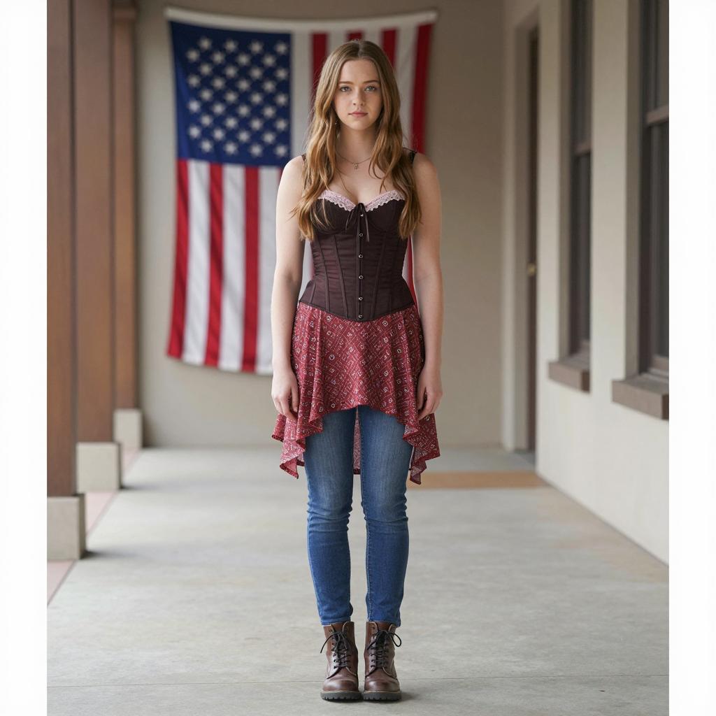 Amanda seyfried jennifers, photograph of a young woman with long brown hair, wearing a dark brown corset-style top with pink lace trim, red patterned skirt with a flowy hem, blue skinny jeans, brown lace-up boots, standing in a sunlit corridor with wooden columns, American flag in background, realistic style, full body shot, neutral expression, casual yet stylish outfit, natural light, daytime