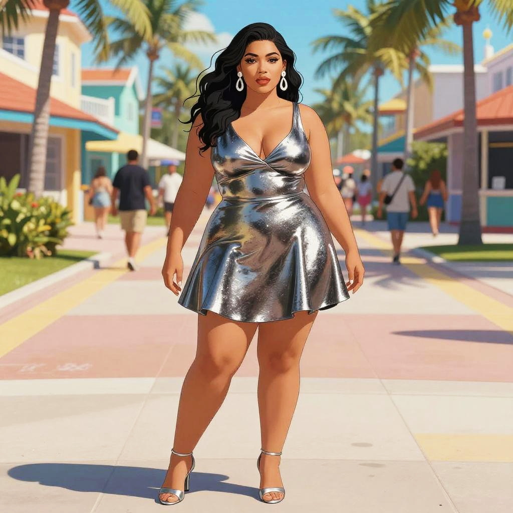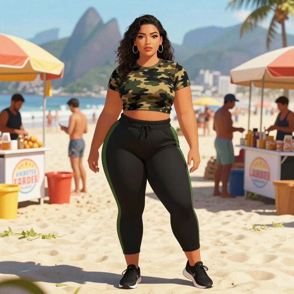 A Plus-size woman in athletic streetwear, wearing a camouflage cropped top and mid-rise track pants with side stripes, black and green colors, and black sneakers, stands at a Street Food Experience in Rio de Janeiro Beachfront, surrounded by vibrant stalls and lively atmosphere. The visual style is digital manga. Sexy. Pretty face and beutiful eyes