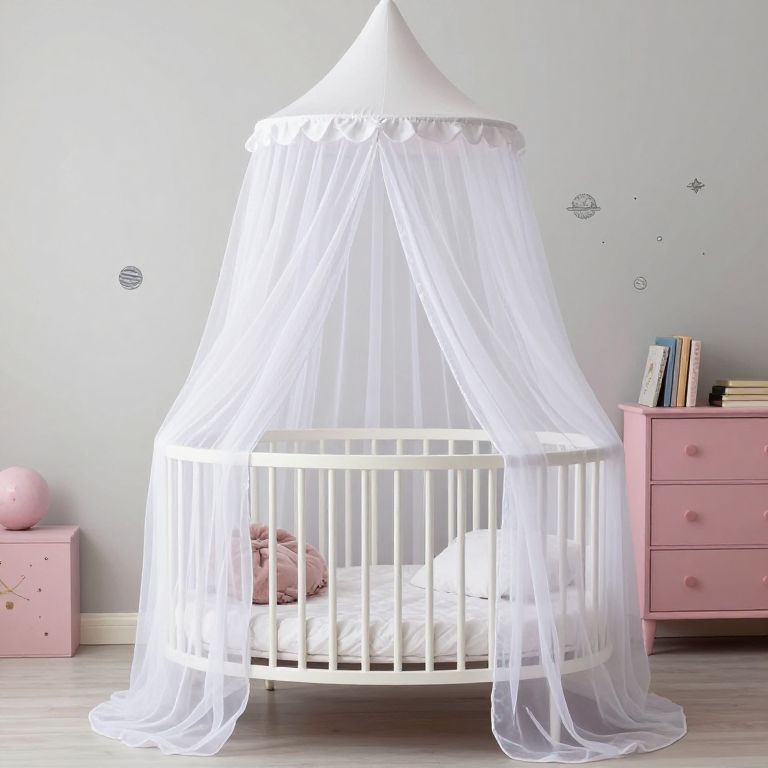White crib netting gracefully drapes over a round baby bed, creating a whimsical dome canopy that combines functionality with fantasy, complemented by soft bedding and a pastel-pink dresser adorned with books and celestial decals in the background.