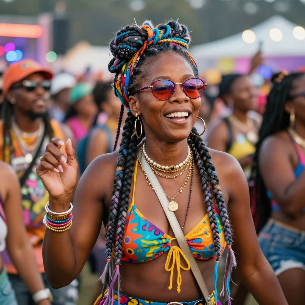Photograph of a smiling Black woman with dark skin, standing in a vibrant outdoor festival. She has long, braided hair adorned with colorful beads and a headwrap, and wears pink-tinted sunglasses, a multicolored bikini top with yellow ties, and layered gold necklaces. She is also wearing large hoop earrings, several bangles, and a white crossbody bag. The background is blurred but shows a crowd of festival-goers, some wearing bright clothing and hats, with colorful lights and tents in the distance. The woman's joyful expression and raised hand gesture add to the lively, festive atmosphere.
