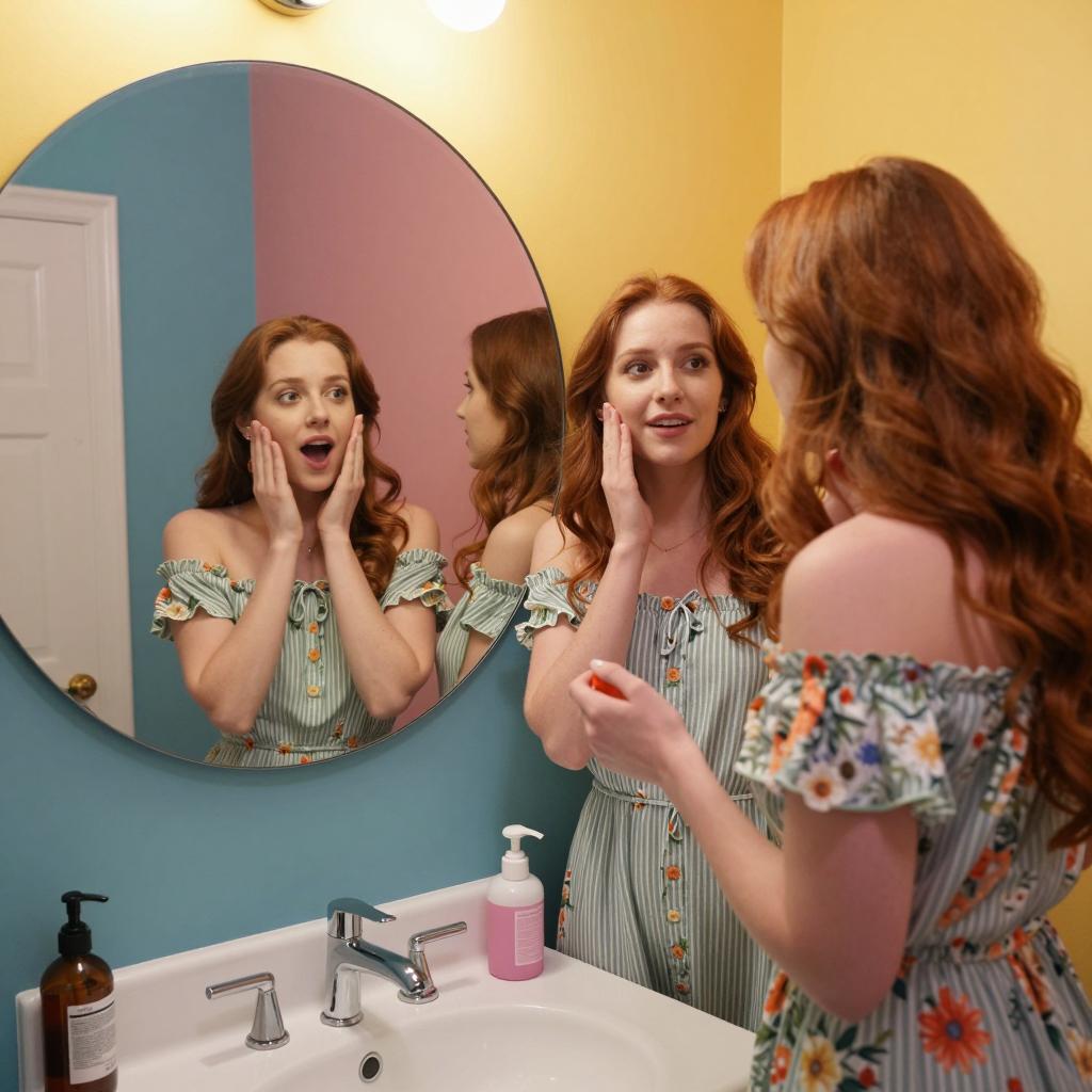 Two women with curly hair, one with red hair in a white polka-dot blouse, the other with brown hair in a pink shirt, stand in a brightly lit kitchen. The woman with red hair looks surprised, mouth open, while the brown-haired woman has her arm around the red-haired woman's shoulder, also with mouth open. Background includes a countertop with bottles and framed pictures on the wall.