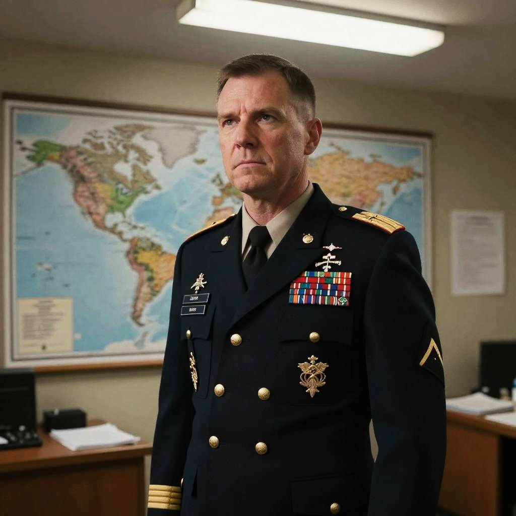 Photograph of a serious-looking, middle-aged white man with short brown hair in a military uniform. He's standing in a dimly lit room with a large world map in the background. His uniform is adorned with various medals, ribbons, and a name tag. The room has fluorescent lights and desks with papers, creating a focused, official atmosphere.