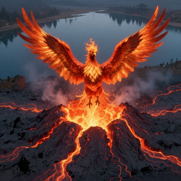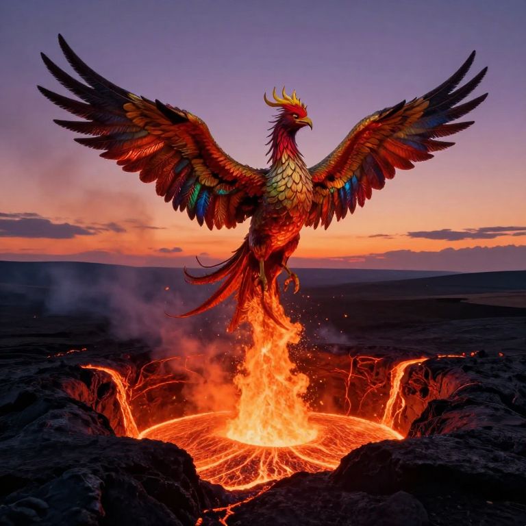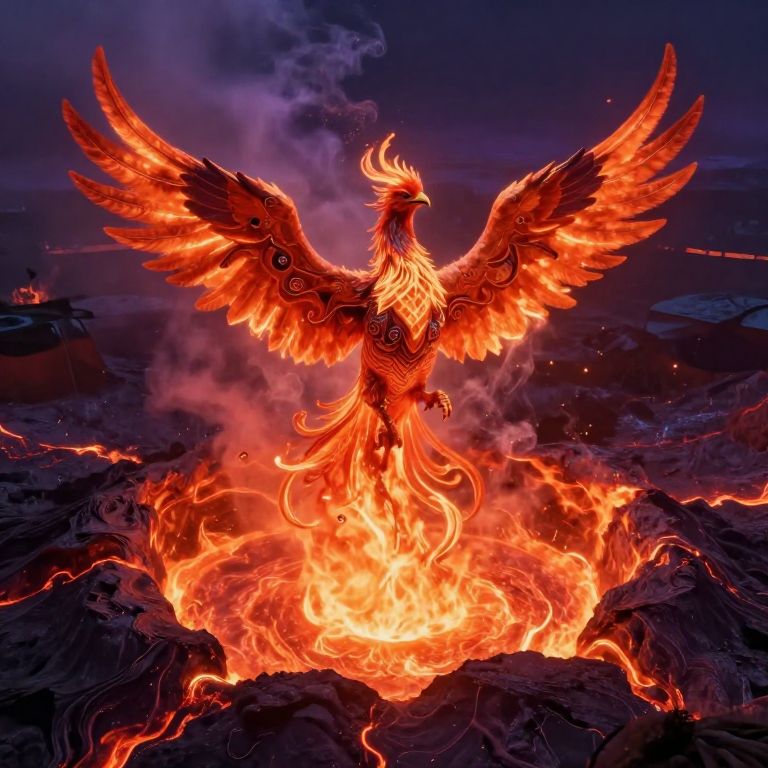 Envision an ethereal landscape where a majestic phoenix rises from the heart of a volcanic abyss, captured through a dramatic overhead viewpoint. The creature emerges from a pool of molten fire, surrounded by fiery tendrils that mimic its ascent and illuminate the scene with a radiant glow. Whispers of smoke dance around the bird, adding to the dreamlike ambiance as it spreads wings embellished with intricate patterns that fuse natural forms with mechanical motifs—a symbol of the harmony between nature and machinery. This mesmerizing scene, bathed in an emotional spectrum of oranges, reds, and purples, captures the essence of rebirth and transformation, inviting viewers into a realm where amazement and admiration meet.