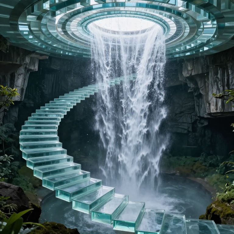 Craft an image depicting an enigmatic landscape featuring impossible architecture, where a grand waterfall gracefully descends through a levitating staircase composed of gleaming, translucent glass blocks. From above, witness the water's defiance of gravity as it ascends vertically, forming a hypnotic spiral that vanishes into thin air before our gaze. This captivating scene, characterized by both mathematical accuracy and whimsical charm, encapsulates the essence of an otherworldly realm where nature and geometry harmoniously intertwine in a mesmerizing dance of light and shadow, evoking a sense of awe and curiosity as we contemplate the mind-bending intricacies of this alluring, dreamlike world.