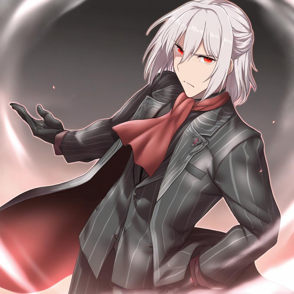 Antonio salieri (second ascension) (fate), fate/grand order, 1boy, red eyes, hair between eyes, grey hair, white hair, short hair, pinstripe suit, suit, black gloves, pinstripe suit, suit, black jacket, long sleeves, formal, half updo, formal, red ascot, by artist yoshi tama, leet