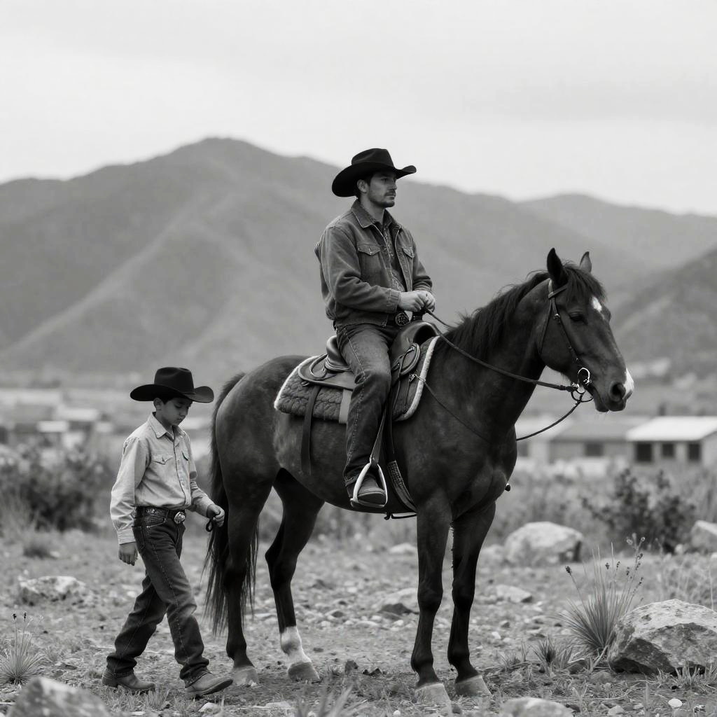 Black-and-white photograph of four mounted cowboys with rifles, riding horses in a desert landscape. A covered wagon follows. Cowboys in western gear, horses kicking up dust, hazy mountain in background. Cowboys' expressions not visible.