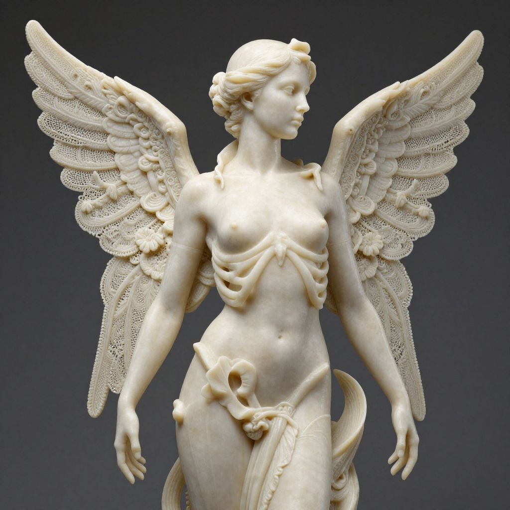 An artistic representation of a female figure, strikingly sculpted to showcase a beautiful dichotomy of human form and skeletal intricacies, complete with ornate ivory lace wings.