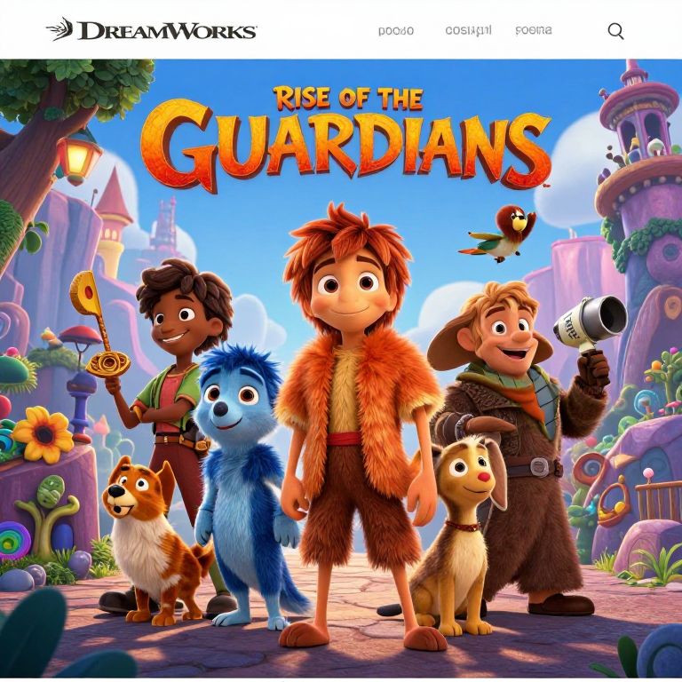 "Rise of the Guardians" movie poster: colorful, cartoon-style characters (red-haired boy, blue dog, brown boy, dark-skinned girl