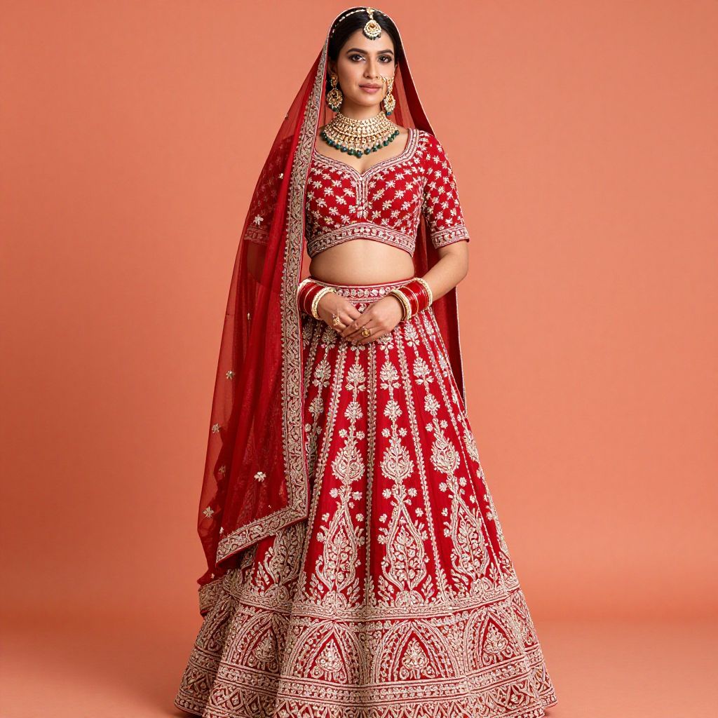 Elegantly poised against a coral backdrop, a woman showcases a vibrant red bridal lehenga adorned with intricate white embroidery, complemented by a matching dupatta and traditional jewelry, embodying the essence of Indian bridal fashion.