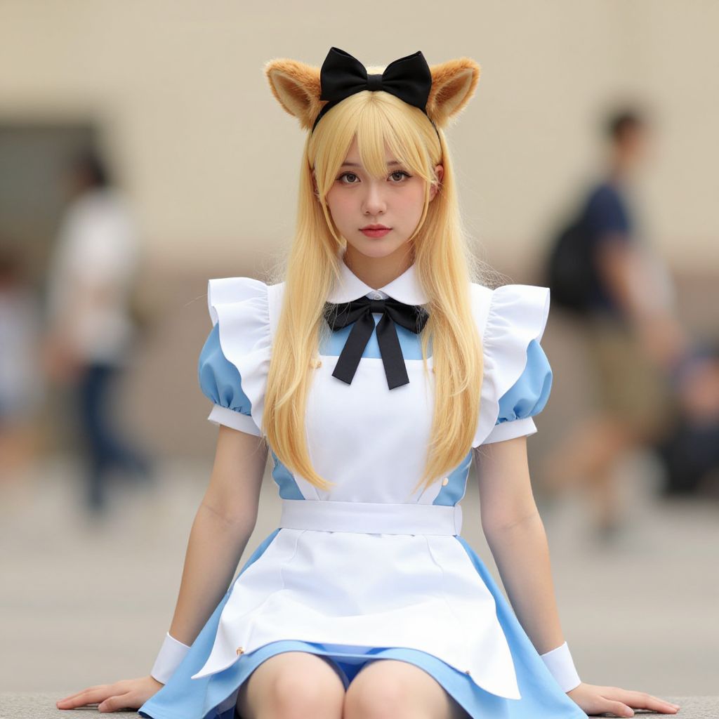 Photograph of an Asian woman with fair skin and long, straight blonde hair, wearing a blue and white Alice in Wonderland-style dress with puffed sleeves and a black ribbon bow. She has bear ears on her head and wears a black bow headband. She is seated with her hands resting on her thighs, in a blurred urban outdoor setting. The background shows indistinct people and buildings, emphasizing her as the focal point. The dress has a white apron and a black neck ribbon. Her expression is neutral, and the image has a soft, slightly overexposed look.