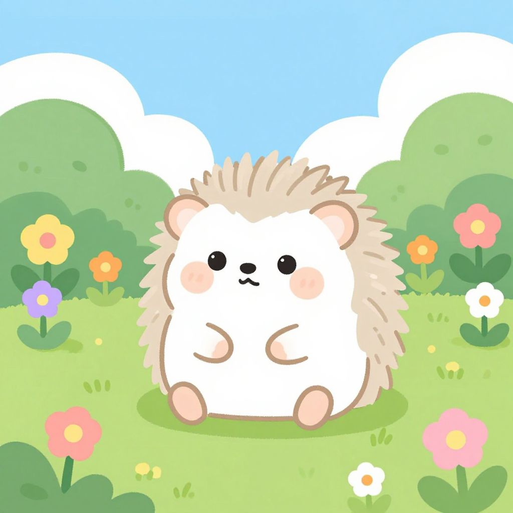 This digital illustration features a cute, chibi-style cartoon hedgehog with white fur and brown spines, holding a large slice of watermelon with both paws. The hedgehog has round, pink-cheeked, black dot eyes, and a small, smiling mouth. Its tiny legs are brown, matching its spines. The watermelon slice is vibrant red with black seeds and a green rind. The background is a simple, solid light beige. The overall style is playful and whimsical, with thick black outlines and bright, flat colors, evoking a cheerful and lighthearted mood.