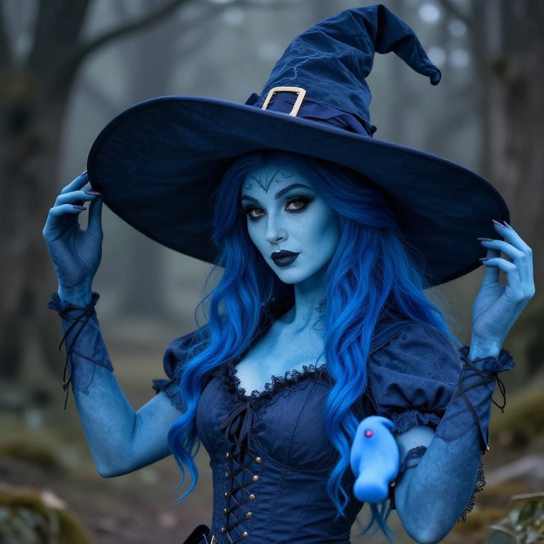 "The Queen Of Hearts blue skinned witch with blue hair, two sets of arms, very pretty, highly detailed, realistic, large witch hat, blue aesthetic, 4K, realistic, Elden ring, fantasy,"