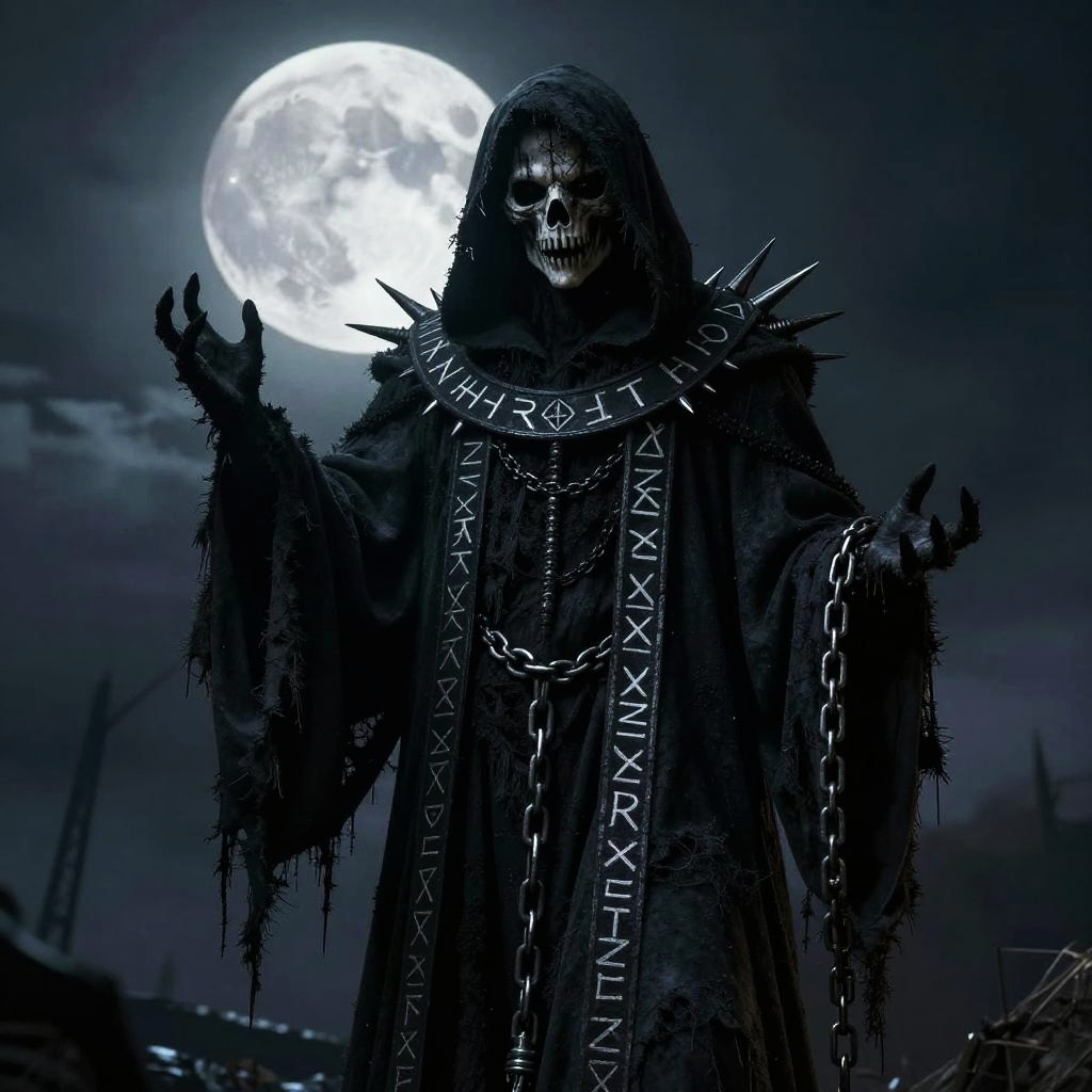 Death metal aesthetic showcasing a grim reaper with flowing tattered cloak, ancient runes glowing faintly, metallic spikes and chains, eerily illuminated by pale moonlight