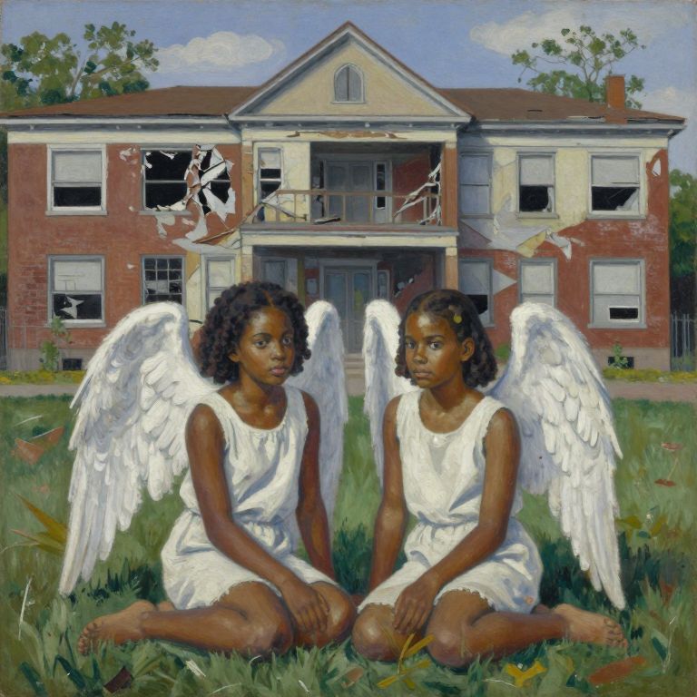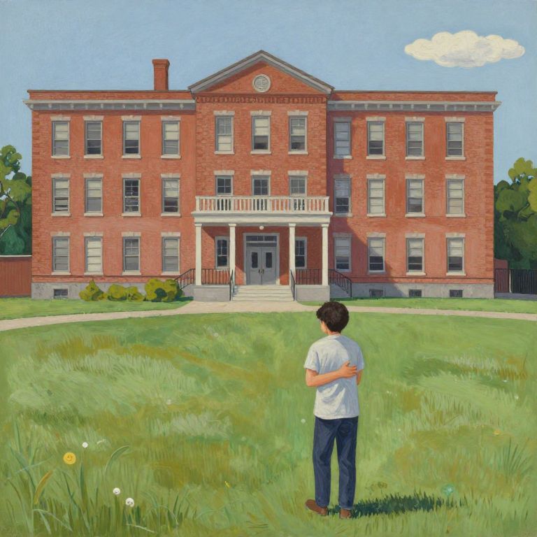 Hug the mental hospital of New Jersey, a patient wandering alone with her thoughts in the backyard. Naïve art. Acrylic art in the style of Sunita Khedekar,