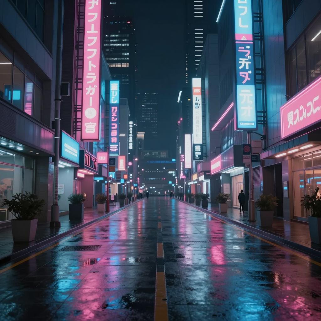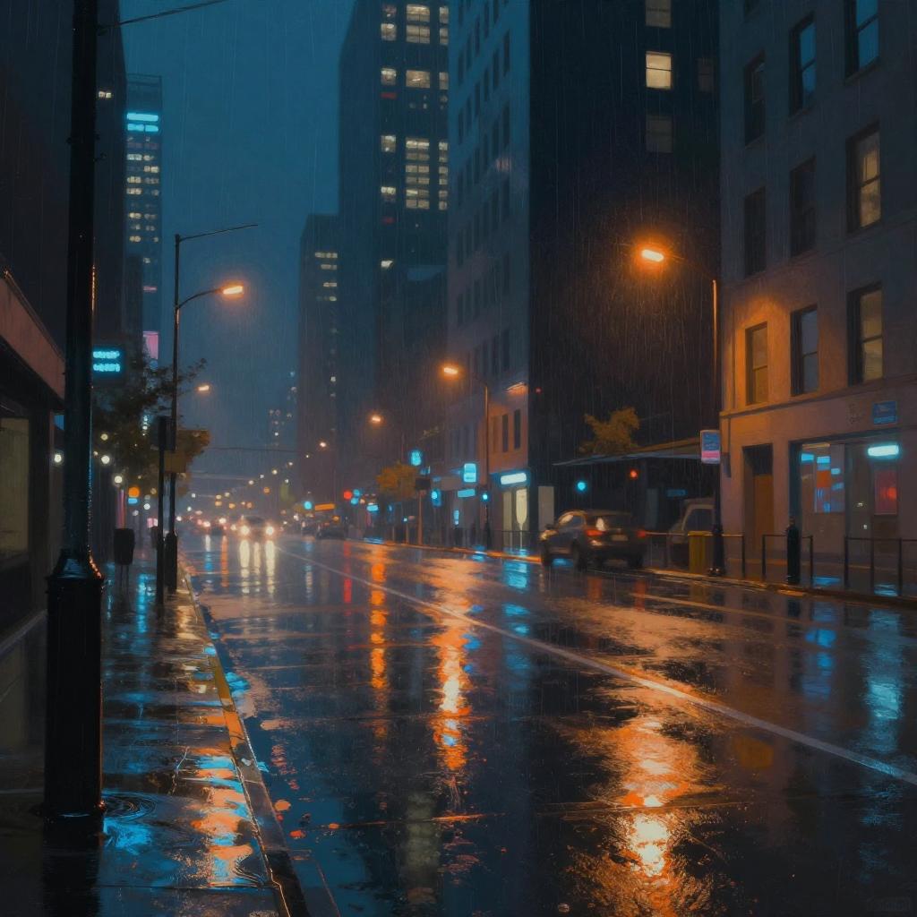 This is a digital painting of a rainy city night scene, viewed from a low angle. Bright neon blue and orange lights reflect off the wet street, creating a vibrant, colorful reflection. Tall buildings with lit windows fill the background, slightly blurred to create depth. The camera angle emphasizes the city's towering structures and the glowing streetlights. The lighting is predominantly cool with warm reflections, adding a dramatic, moody atmosphere.