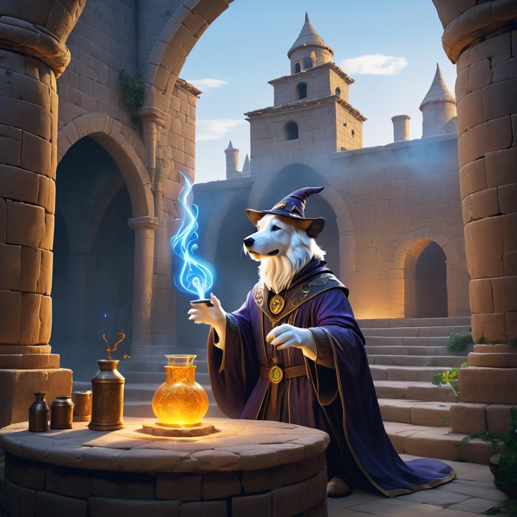 Cinematic styled digital artwork depicting an anthropomorphic dog dressed as a wizard in a purple robe and hat, brewing a glowing magical potion at an ancient stone altar within mystical ruins. The scene features volumetric lighting, glowing blue magical energy, and medieval architectural elements including stone arches and a distant tower.