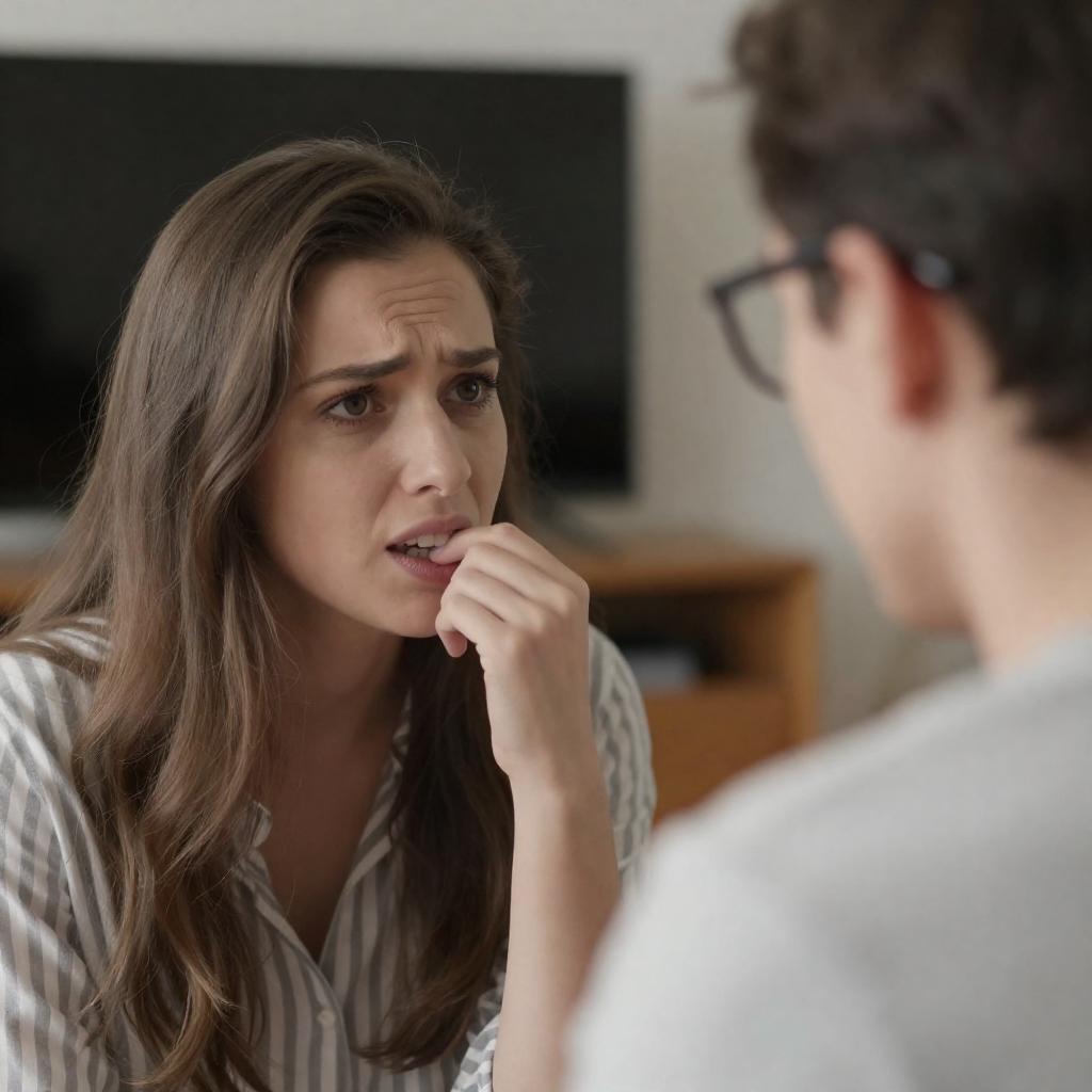 Photograph of a young woman with long brown hair wearing a striped shirt, biting her finger with a focused and slightly concerned expression. She is looking intently at a man with glasses, whose face is blurred in the foreground. The indoor background includes a blurred television and wooden furniture.