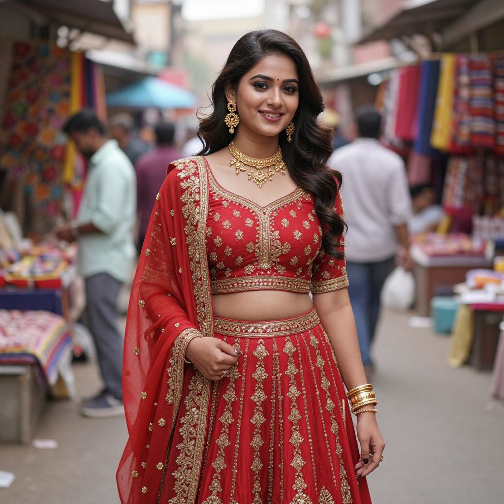 Photograph of an Indian woman with long black hair, wearing an ornate gold embroidered crop top and matching skirt, with a beige saree, gold